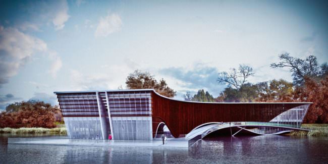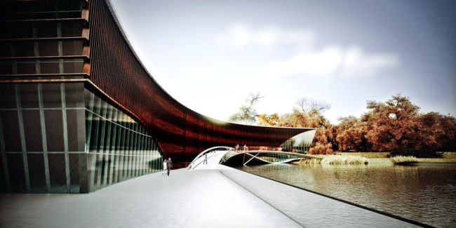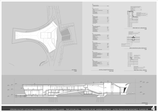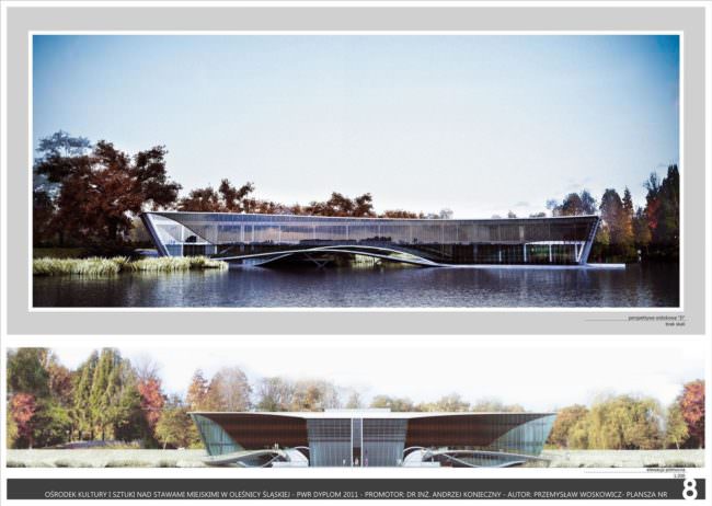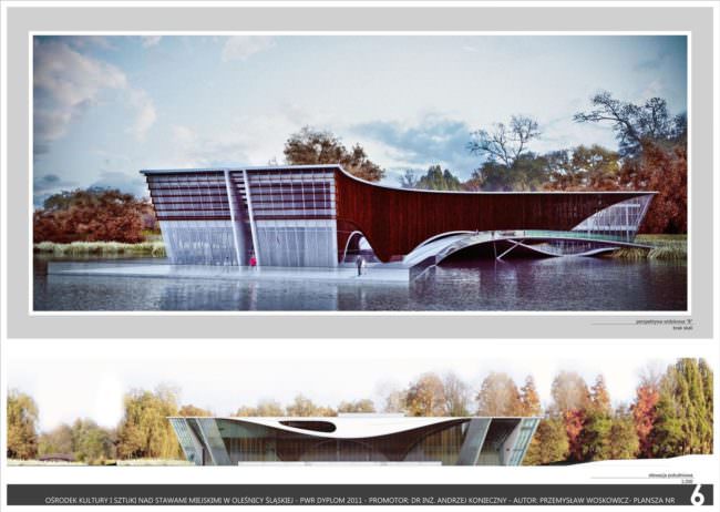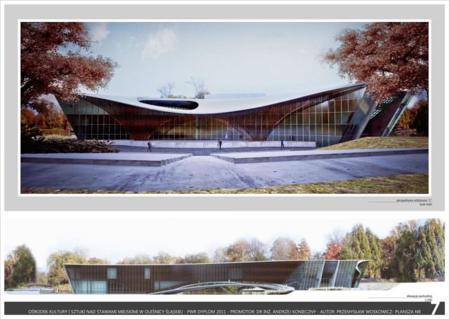 Ideą koncepcji było zaprojektowanie domu kultury i sztuki w celu uzupełnienia istniejącego już programu terenu rekreacyjno – sportowego miejskich stawów w Oleśnicy. Obiekt ma skupiać w sobie podstawowe dziedziny sztuki, takie jak malarstwo, rzeźba, ceramika, taniec, teatr, muzyka oraz pokrewne temu dziedziny. Ma także umożliwiać swobodne rozwijanie rzemiosła ludziom o zainteresowaniach artystycznych, ma być otwarty dla szerokiego grona użytkowników, prezentować prace oraz osiągnięcia miejscowych twórców, a także twórczości innych artystów. Obiekt w założeniu ma promować działania kulturalne w mieście, jak i w całym regionie. Budynek zaprojektowano w taki sposób, aby nie dominował w otaczającym terenie. Obiekt jest uzupełnieniem funkcji, a nie punktem kulminacyjnym kompleksu. Ośrodek kultury nie konkuruje z krajobrazem, a stanowi z nim spójną całość, wtapiając się w otoczenie, jak i w układ komunikacyjny. Nowo projektowane ciągi komunikacyjne płynnie łączą się z istniejącymi ciągami pieszych zachęcając tym samym do zejścia ze starych ścieżek. Budynek swoim lekkim kształtem nawiązuje do zacumowanej przy brzegu łodzi oraz falującej wokół niej wody. Jednym z założeń projektu było nie tylko pozostawienie amfiteatru oraz jego sceny, ale powiązanie funkcjonalno – przestrzenne sceny amfiteatru obecnej sceny plenerowej ze sceną sali widowiskowo kinowej w celu umożliwienia swobody kreowania przedstawień teatralnych. Obiekt stanowi również pomost na wyspę, wcześniej zapomnianą i zaniedbaną, a także oferuje w jej obrębie restaurację dla spacerowiczów. Projektowany budynek jest powiewem świeżości w mało odważnej pod względem architektonicznym Oleśnicy. Może być początkiem do wprowadzania śmielszych form w tutejszym otoczeniu. Biorąc pod uwagę całokształt obiektu, jego formę, funkcję oraz położenie uważam, że będzie z łatwością realizował swą funkcję.
