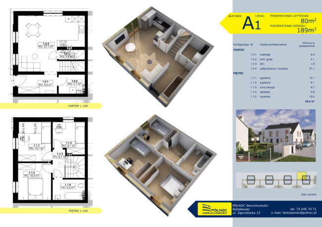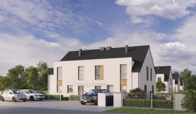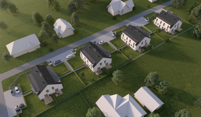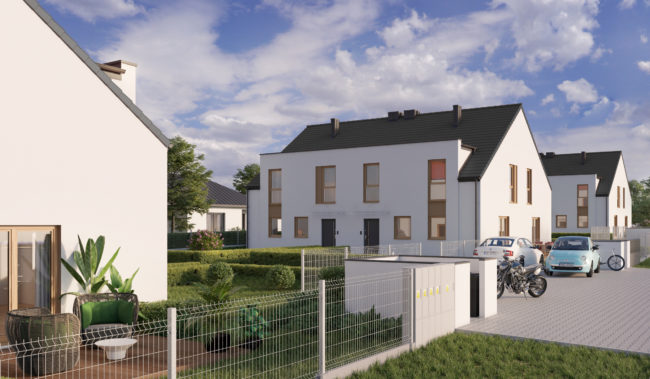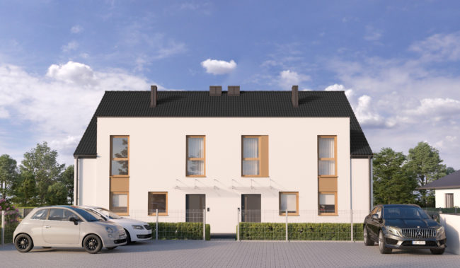 Na podłużnej działce zaprojektowaliśmy 4 budynki wolnostojące. Każdy z nich posiada 4 lokale mieszkaniowe z odrębnymi wejściami oraz dużą ilością zieleni. Na parterze został zlokalizowany pokój dzienny z przestronną strefą wypoczynkową połączony z kuchnią i jadalnią. Znajdziemy tu również pomieszczenie gospodarcze, wiatrołap z pojemną szafą oraz WC. Na piętrze znajduję się cześć nocna w której zaprojektowano 3 sypialnie oraz dużą łazienkę.