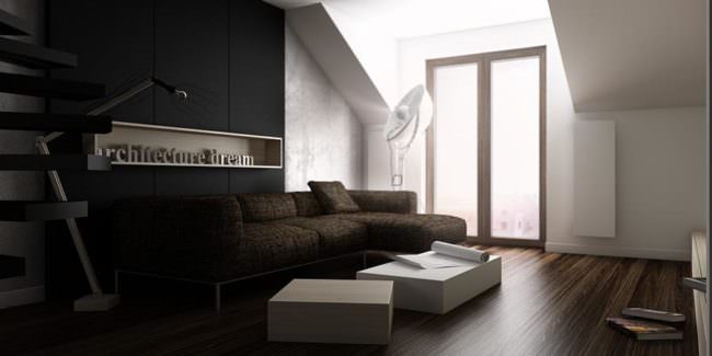 Stylowy projekt wnętrza. Kombinacja ciepłego, jasnego drewna z ciemnymi detalami.