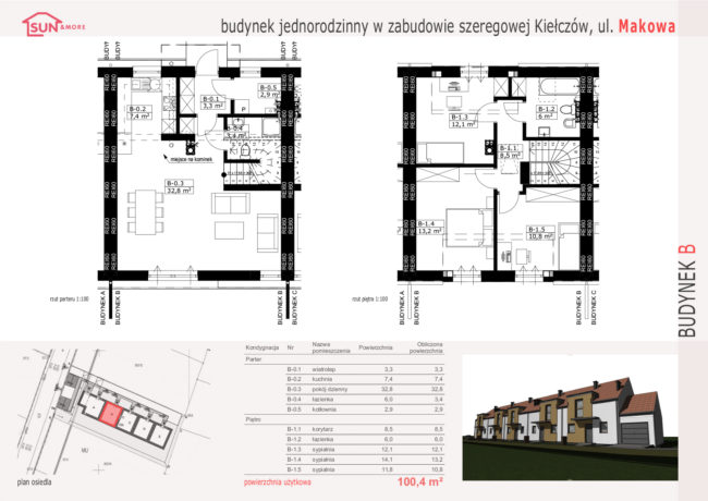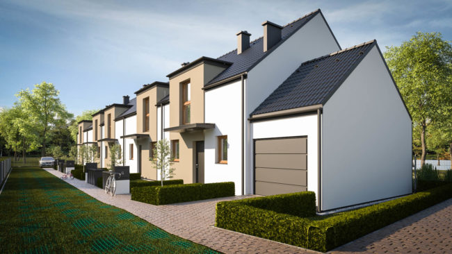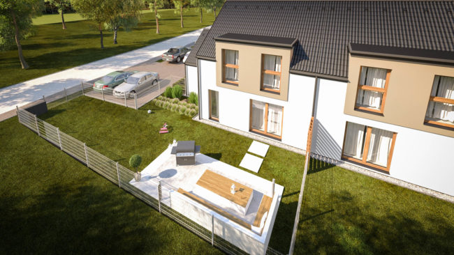 Na działce zaprojektowano 5 segmentów o powierzchni około 100m² każdy. Dla przyszłych mieszkańców wygospodarowaliśmy ogródki i miejsca postojowe. Zwarta bryła obiektu w połączeniu z lukarnami sprawia, że zaprojektowane budynki są proste, lecz nie banalne. Lukarny stanowią tu nie tylko element dekoracyjny, ale i funkcjonalny – zwiększają powierzchnię poddasza i poprawiają jego doświetlenie.